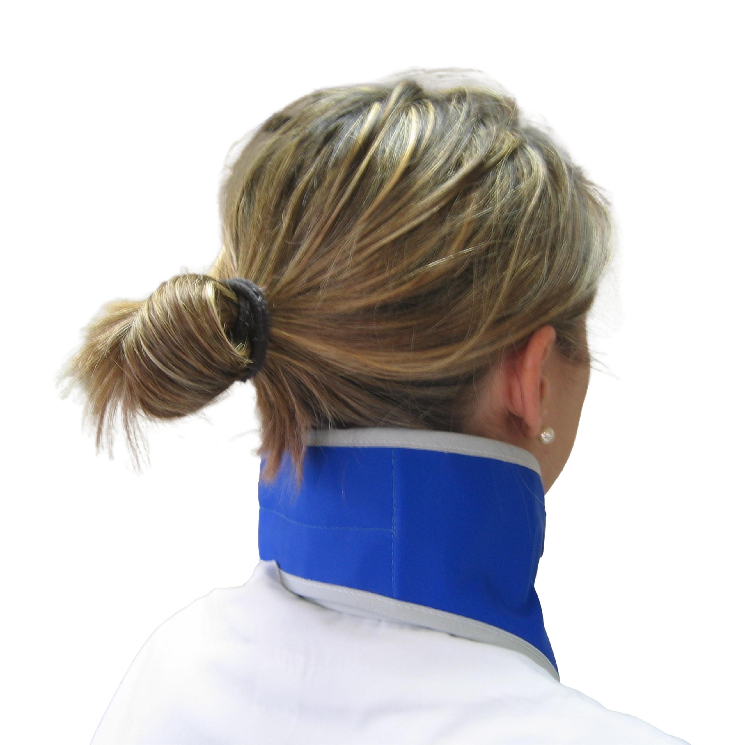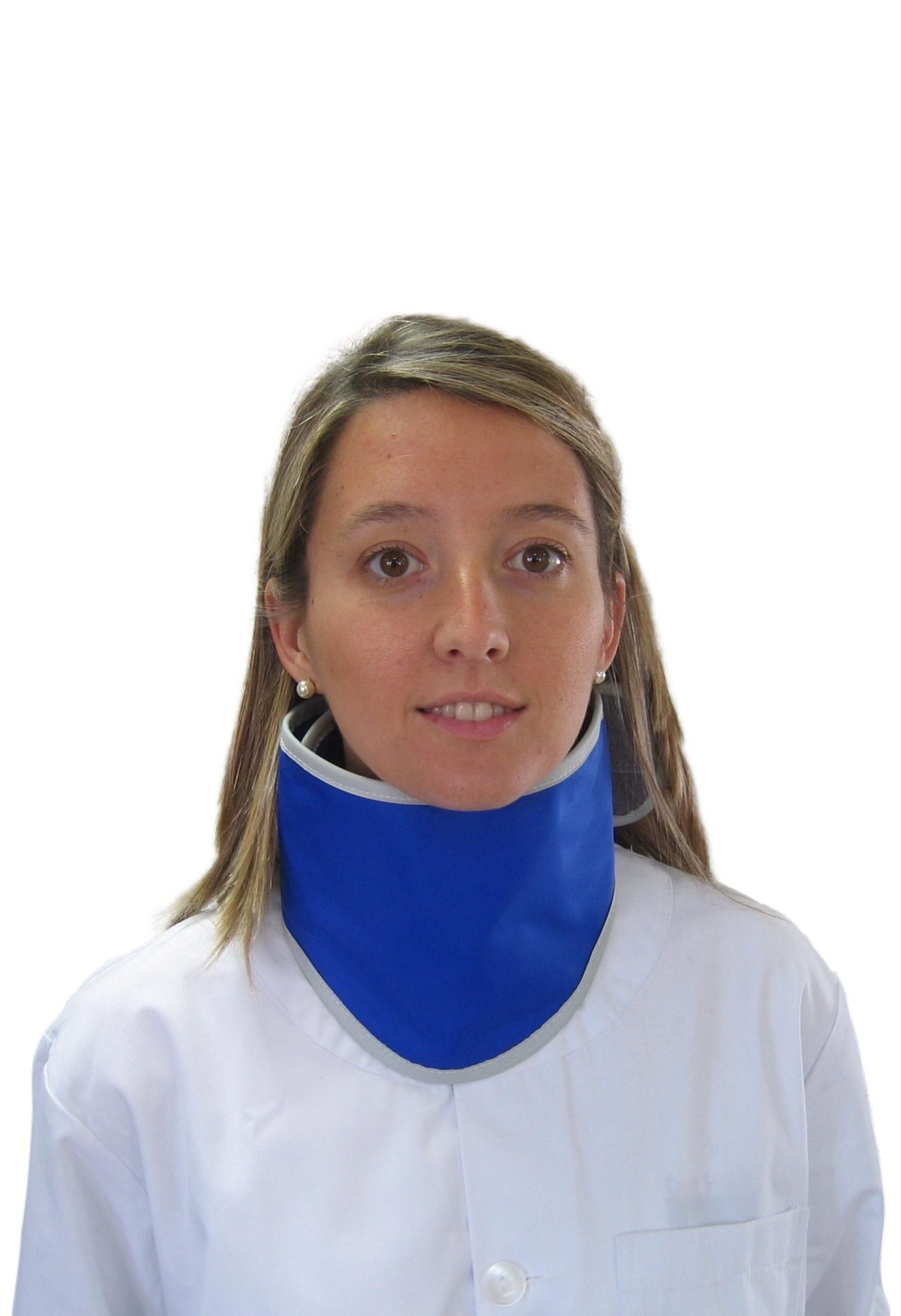 Collare antix con pettorina idoneo a proteggere la parte frontale del collo (tiroide) e parte dello sterno. Modello senza cuciture. Chiusura a strappo regolabile. Protezione Eq. Pb mm 0,50. A richiesta può essere prodotto con un cinturino d’aggancio al grembiule al fine di evitarne lo smarrimento. Tessuti e bordature a scelta per facilitarne l’individuazione in reparto. Possibilità di personalizzazione della pettorina e/o della fascia posteriore di chiusura del collare con scritta e/o con logo, tramite ricamo.