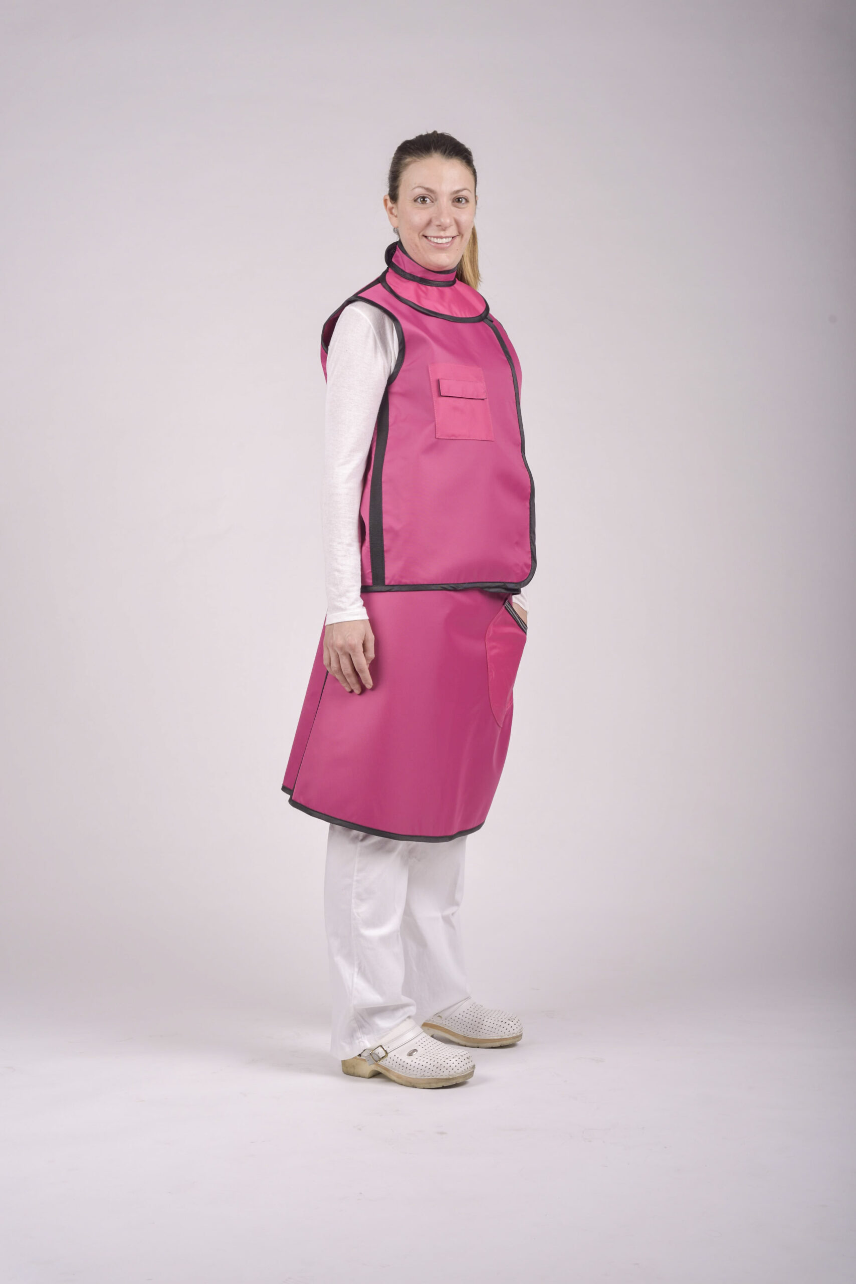 Composti da materiale radioprotettivo con l’aggiunta di metalli che sostituiscono parzialmente il piombo riducendo così il peso rispetto ad un classico grembiule piombato standard.