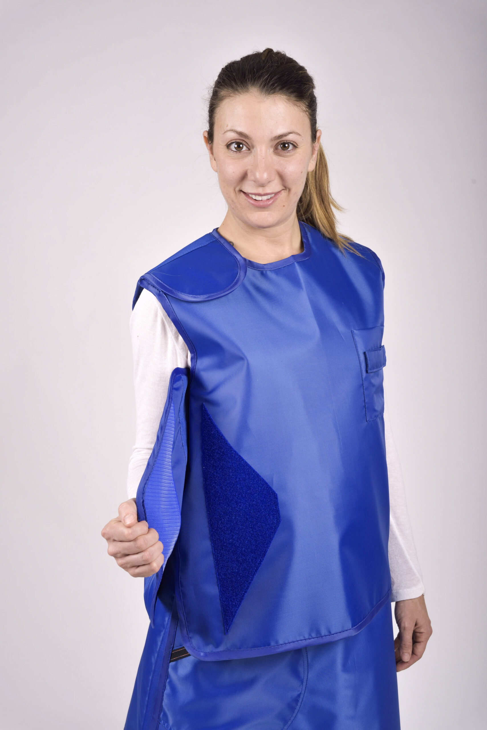 Composti da materiale radioprotettivo con l’aggiunta di metalli che sostituiscono parzialmente il piombo riducendo così il peso rispetto ad un classico grembiule piombato standard.